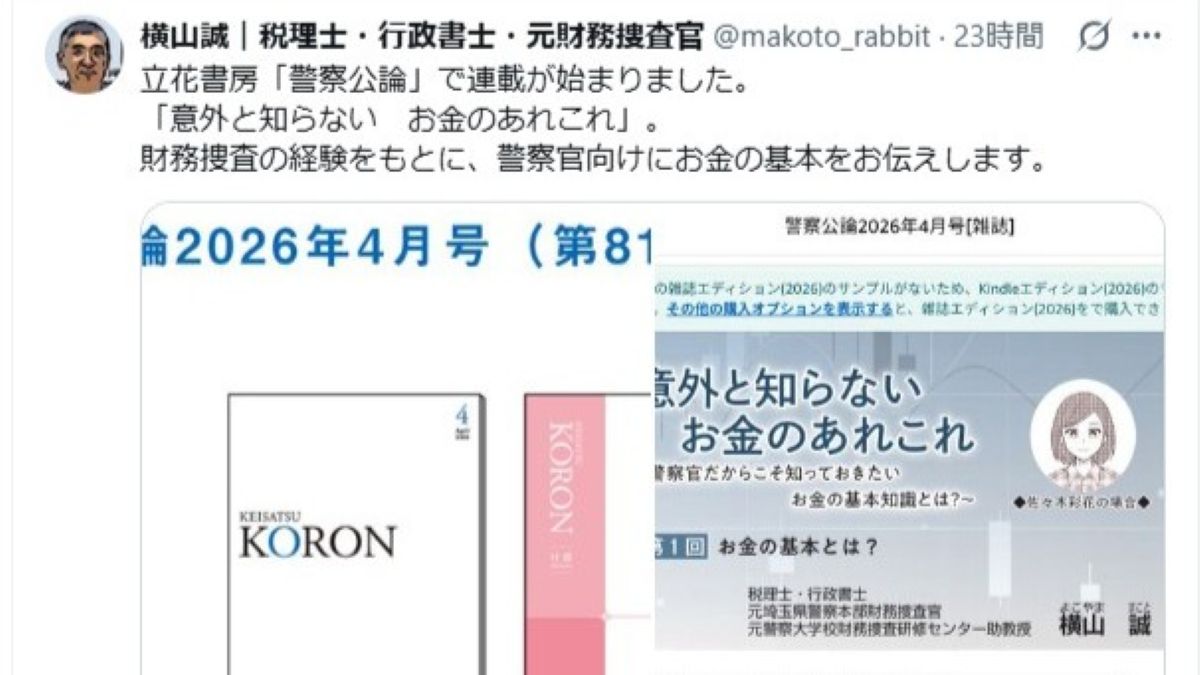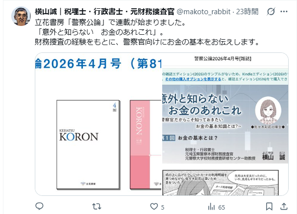立花書房の雑誌「警察公論」で連載がはじまった「意外と知らない お金のあれこれ」のお知らせです。