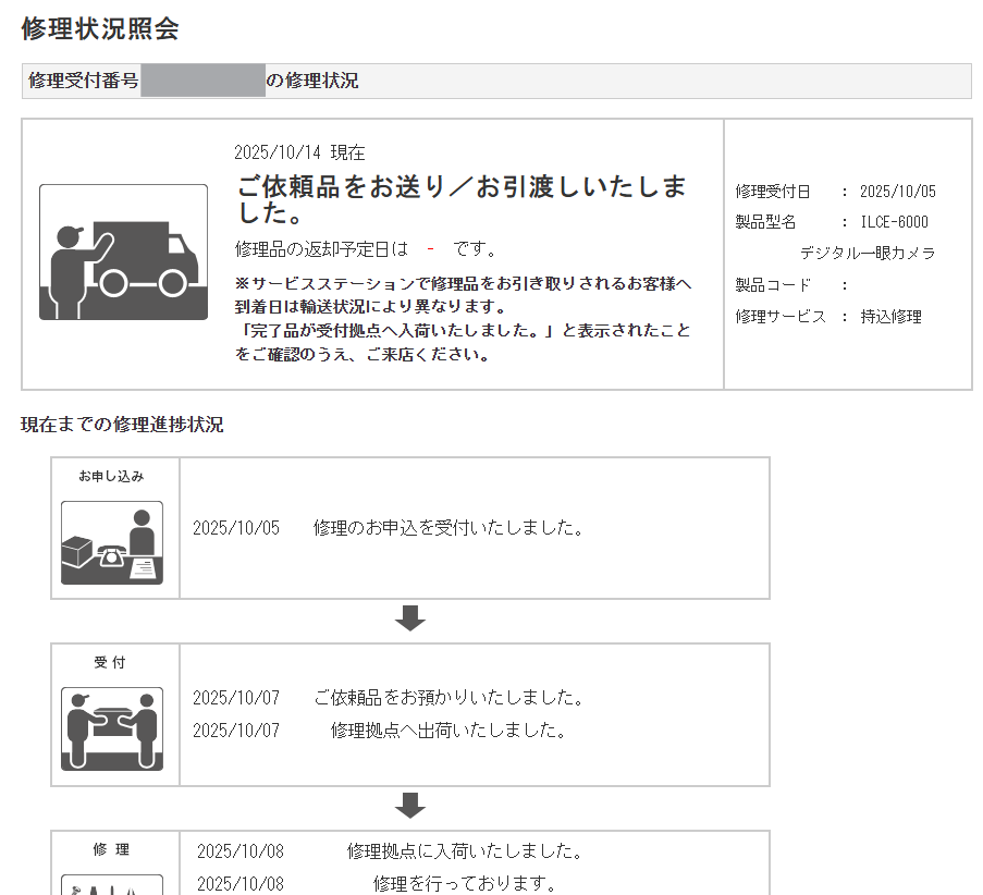 10月5日に持ち込み、10日にサービスセンターでの引き取りとなりました。